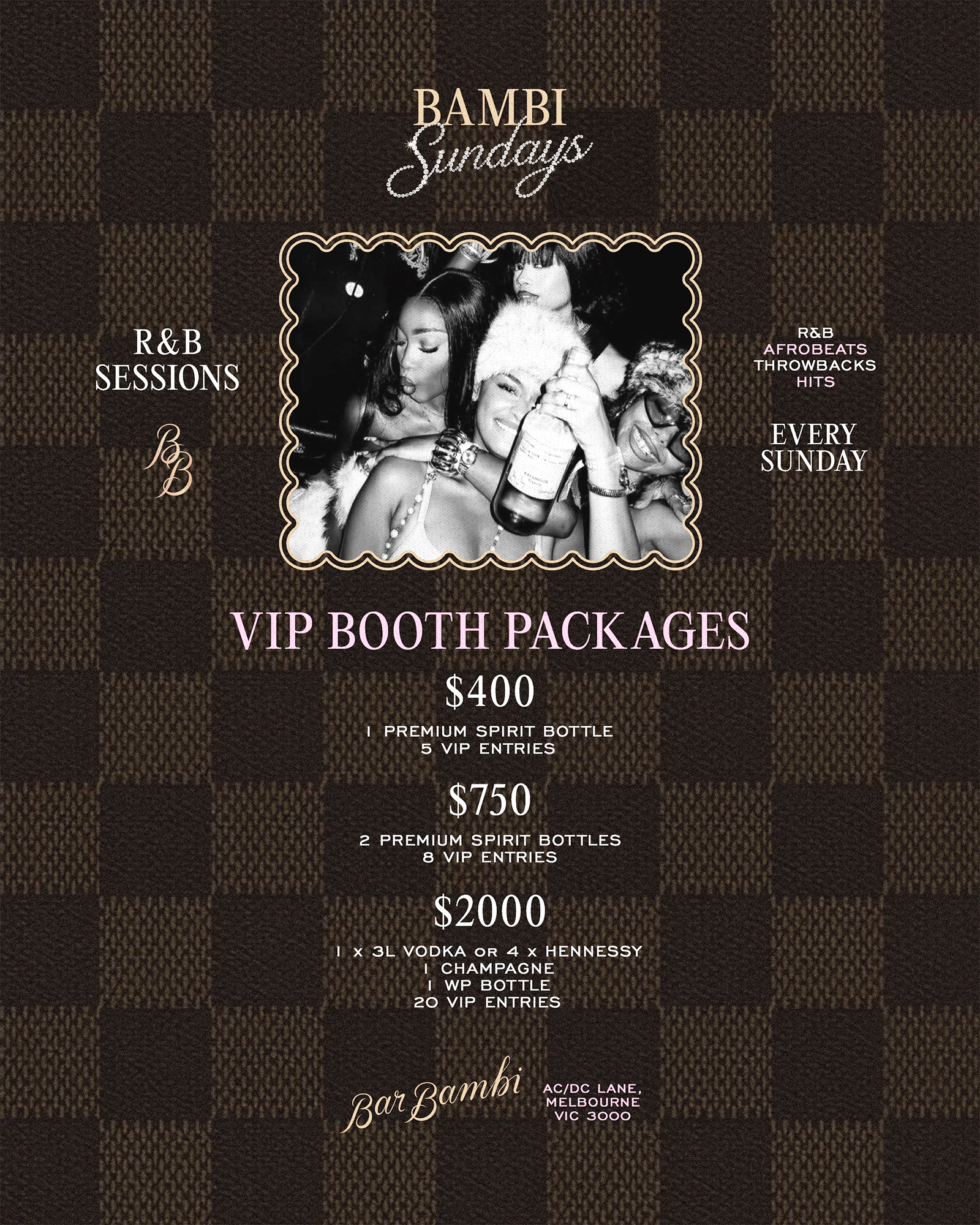 Book A VIP BoothCelebrate with R&B Sessions and a touch of class. Book your VIP Booth area with Premium Bottle Service.EVERY SUNDAY @ Bar Bambi VIP Booth Booking Form